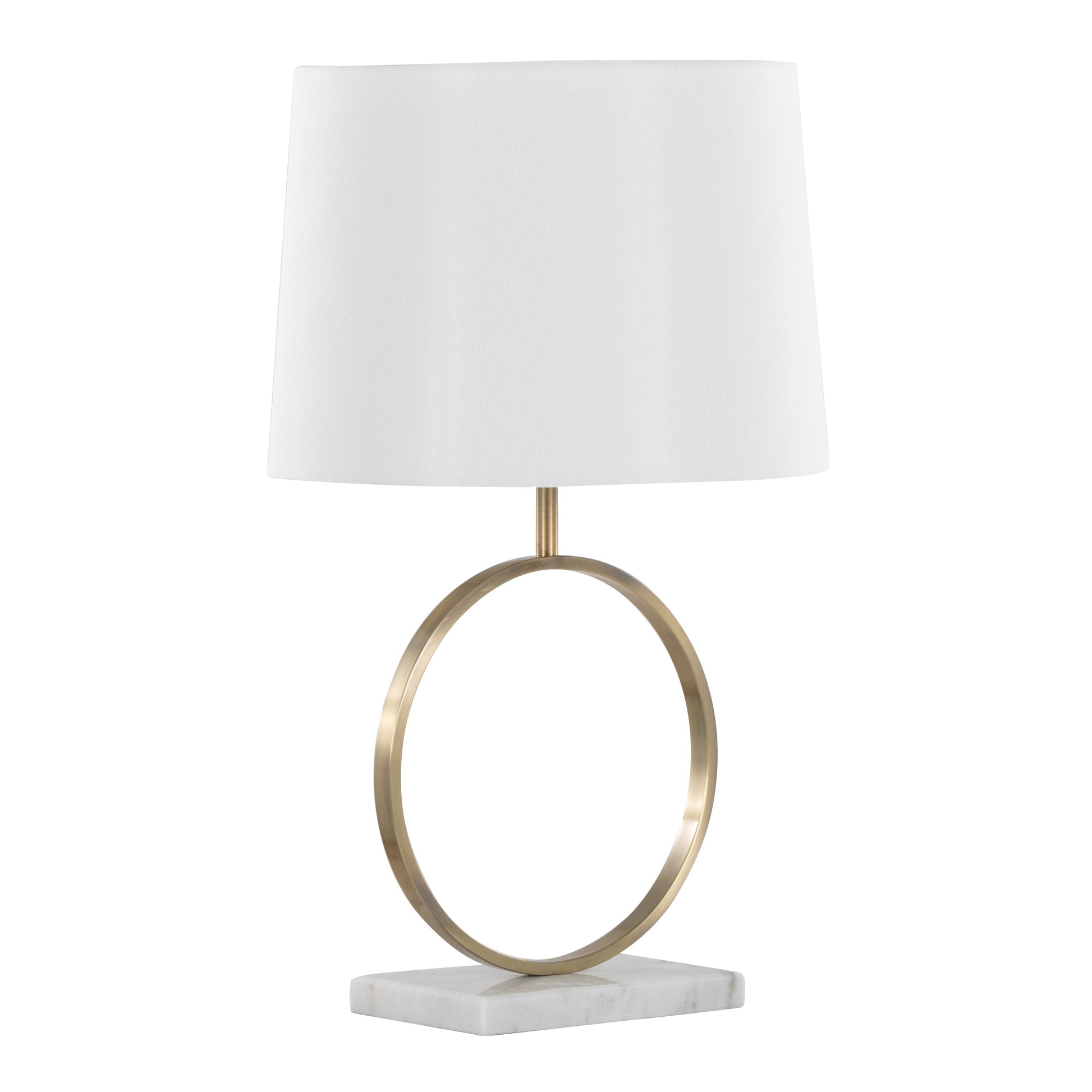 • Materials: Marble base, gold metal frame, linen shade